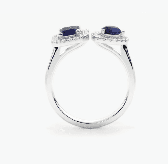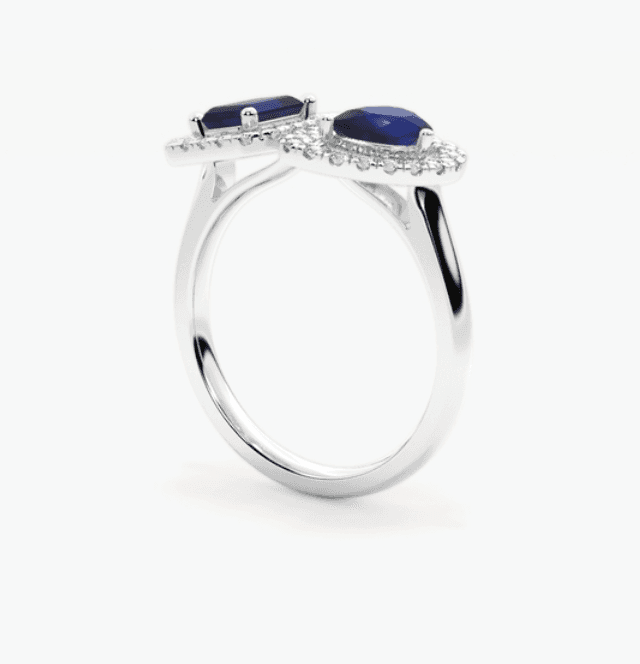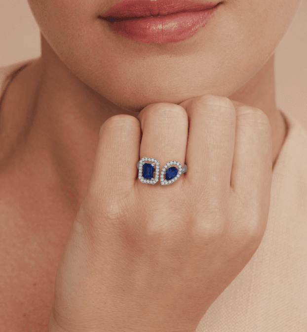 A bold expression of contrast and harmony. This two-stone masterpiece pairs a deep blue emerald-cut sapphire with a pear-shaped sapphire, both encircled by halos of fine white diamonds. The result is a perfect balance of geometry and grace.